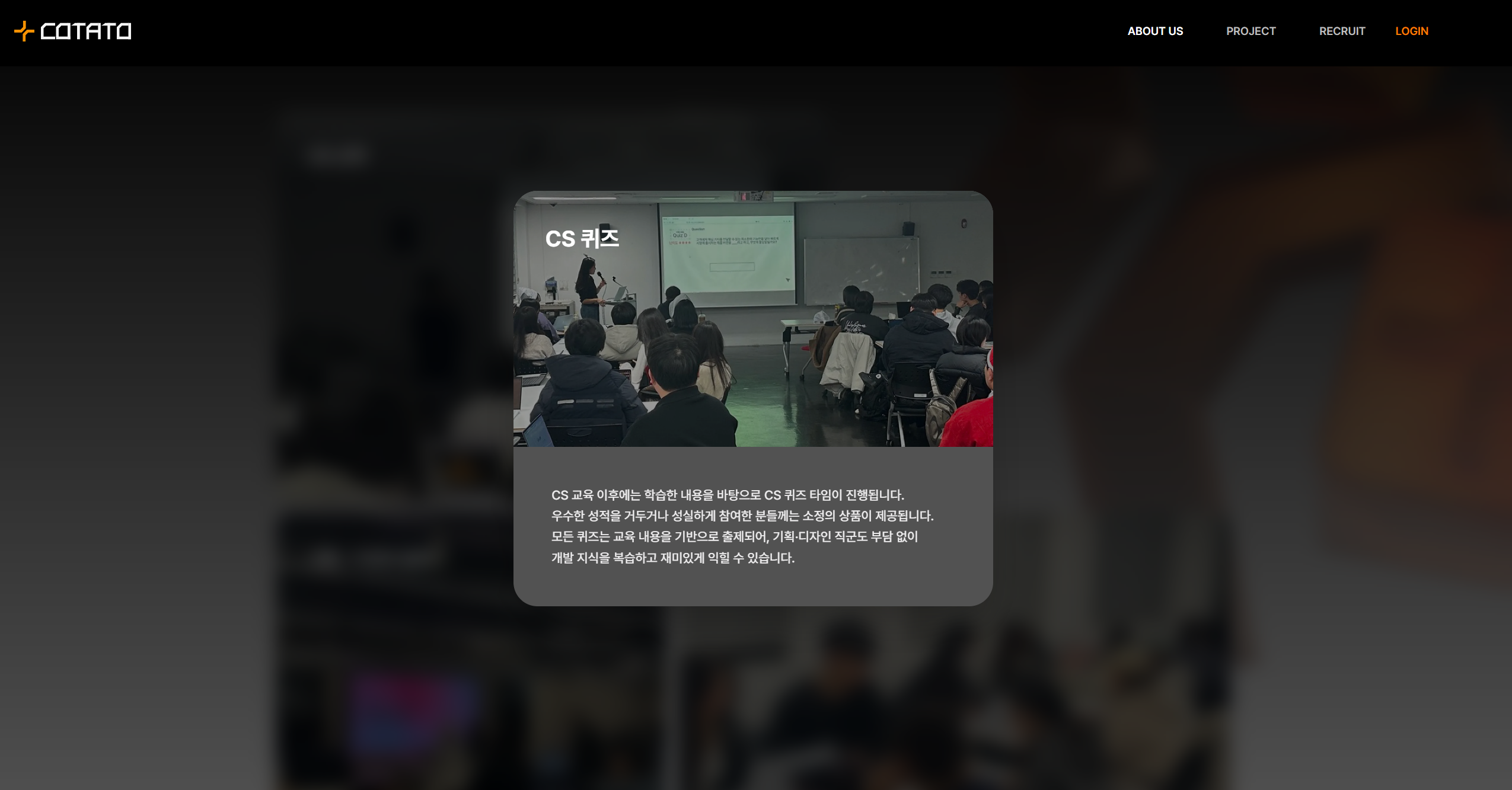 그리고 같은 운영진 분들과 함께 코테이토 리뉴얼 프로젝트도 진행하게 되면서 기존 코테이토 사이트의 문제점을 개선한 리쿠르팅 사이트 & 리뉴얼 홈페이지 사이트를 제작하게 되었습니다. 이 과정에서 코테이토에 대한 애정이 더욱 커졌고, 더 좋은 동아리가 되길 바라는 마음에 사이트도 정말 열심히 밤새워가며 만들었던 기억이 큽니다.